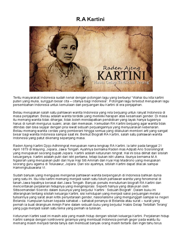 Raden Ajeng Kartini is a Javanese and an Indonesian national heroine. Biografi dan profil lengkap raden ajeng kartini ra kartini. Kartini was a pioneer in the area of women s rights for Indonesians.